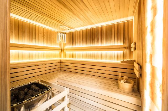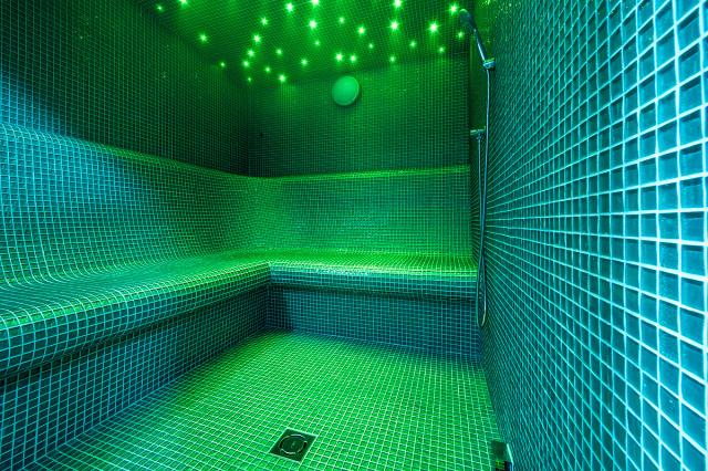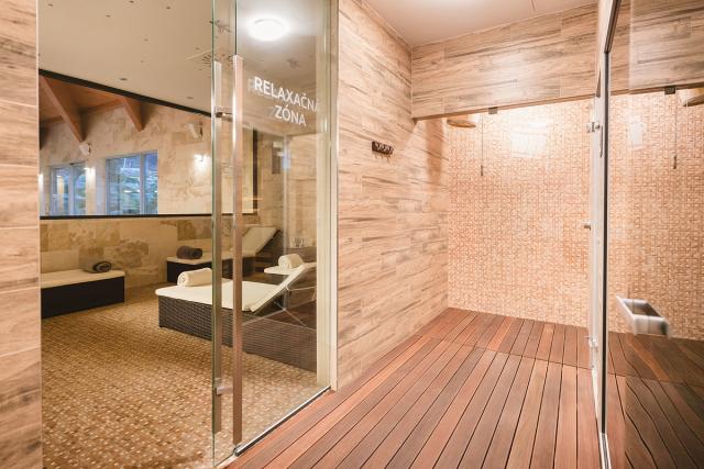 pára, relaxační koutek s lehátky, masáže*, kosmetické služby*,